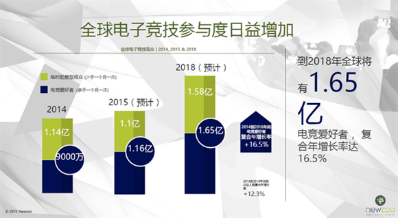 近些年電子競技正在從小眾圈層向大眾化方向擴散,以至於推升出了電競經濟的概念和市場。根據Newzoo發布的《2015全球移動游戲報告》顯示,僅2015年有1.16億電競愛好者(不包含1.1億臨時起意型觀眾)參與到這項活動中,預計到2018年全球將有1.65億用戶群。而這部分電競愛好者往往也是網絡世界中最活躍並願意分享觀點看法的群體,即我們常說的UGC用戶,甚至不乏自帶流量的KOL。
