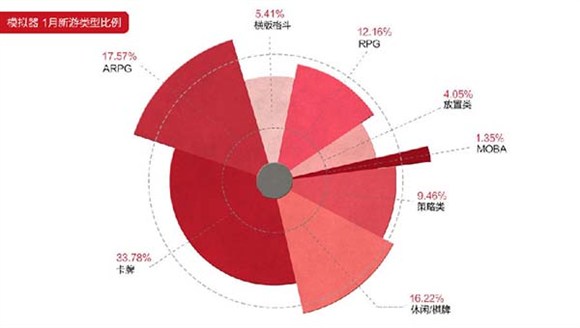 新游:1月首發新游總計74款,卡牌類、休閒/棋牌類占據主流,MOBA類新游僅有1款