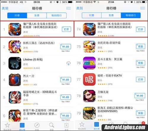 圖2:《僵屍獵人K》App Store付費榜第一&暢銷榜成績