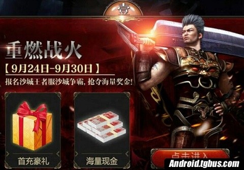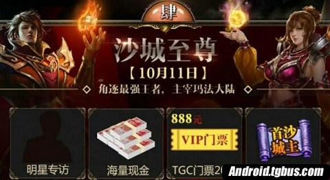 1).安卓/蘋果各開一組服務器,沙城霸主第一公會:獎勵現金各66666元、TGC的VIP門票各20張(每張價值888元)。