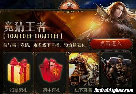 10月10日-10月11日,群雄逐鹿誰能登頂?三大公會誰是最強?參與霸主競猜,觀看線下直播,領海量豪禮!對於沒有就會進入傳奇王者服的玩家來說,看直播為兄弟吶喊助威也是不錯的選擇。看攻沙直播,參與霸主競猜的玩家也有可能獲取海量獎勵。
