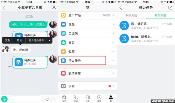 在點對點聊天時,長按文字或語音可將聊天內容實時轉為待辦任務,之後只要在“我”的頁面打開“待辦任務”按鈕,就可以查看各種備忘。重要的事不必說三遍,也不會遺忘了。