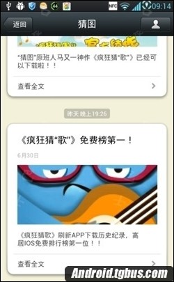 然後是微信版,瘋狂猜圖官方微信公眾賬號:fengkuangcaitu。添加之後,官方會給你推送瘋狂猜歌的游戲信息,然後你點擊進入,就可以進入微信在線版了,點擊【馬上試玩】。就可以在微信裡玩瘋狂猜歌了。